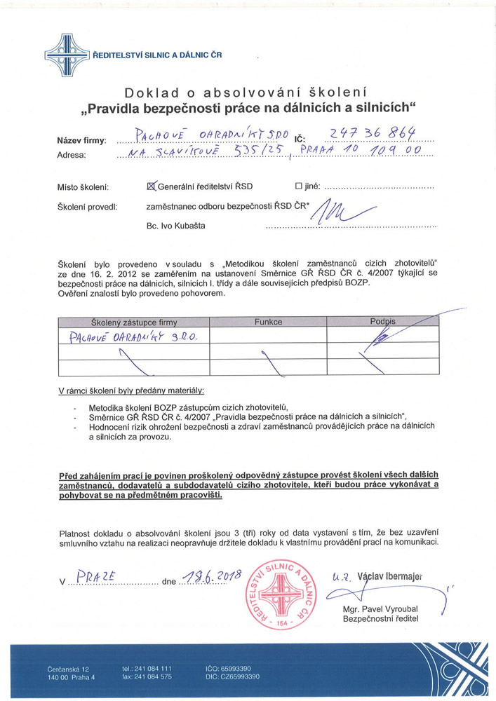 Všichni naši zaměstnanci jsou proškoleni, kapacitně jsme schopni zabezpečit až 100 km/1 den.